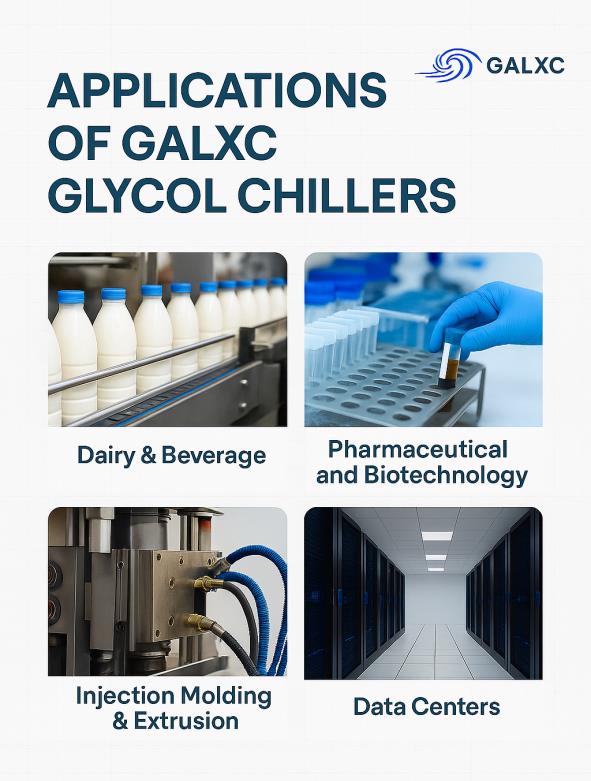 From food factories to pharmaceutical labs, and from plastics manufacturing to mission-critical data centers, GALXC glycol chillers deliver stable, efficient, and long-lasting cooling for every industrial process.