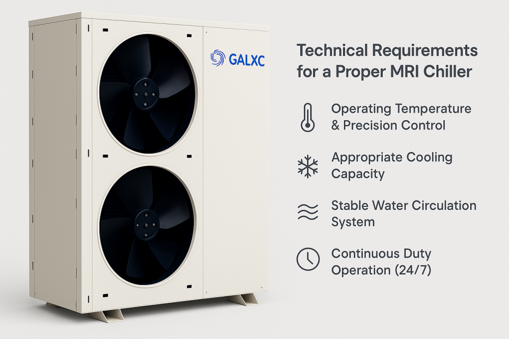 An MRI chiller must be accurate, stable, reliable, and compliant with the strict standards required by imaging environments. GALXC Medical Chillers, designed according to the specifications of Siemens, GE, Philips, and Canon, are considered one of the most trusted cooling solutions for MRI systems. 1. Operating Temperature & Precision Control A standard MRI chiller must […]